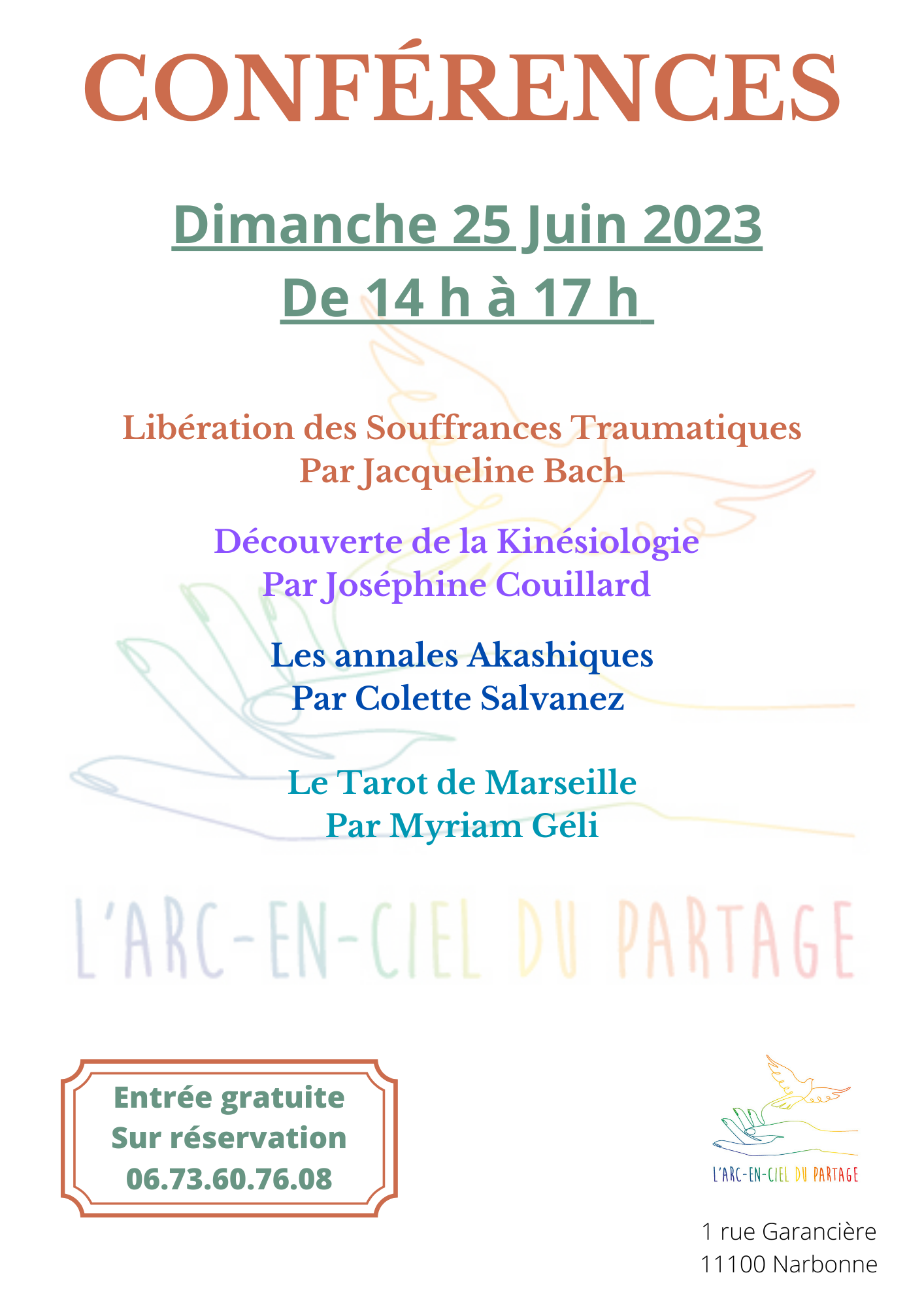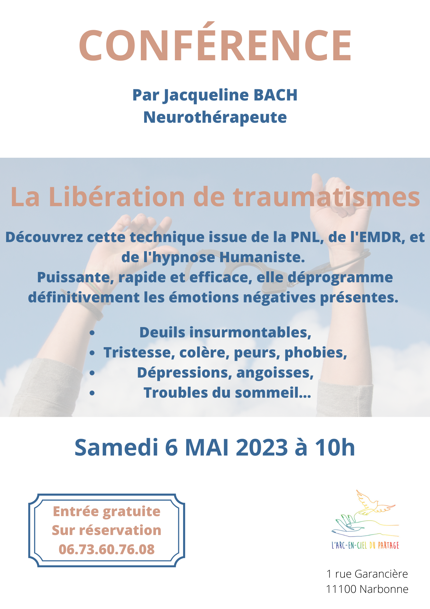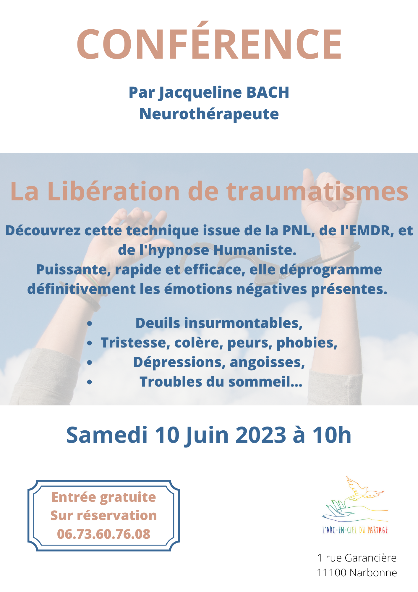 L'arc en ciel du partage 62 avenue du Général Leclerc, Narbonne, FranceConférence L.D.S.T (Libération Des Souffrances Traumatiques) Par Jacqueline Bach, Neurothérapeute Entrée Gratuite Réservation Jacqueline 06.73.60.76.08