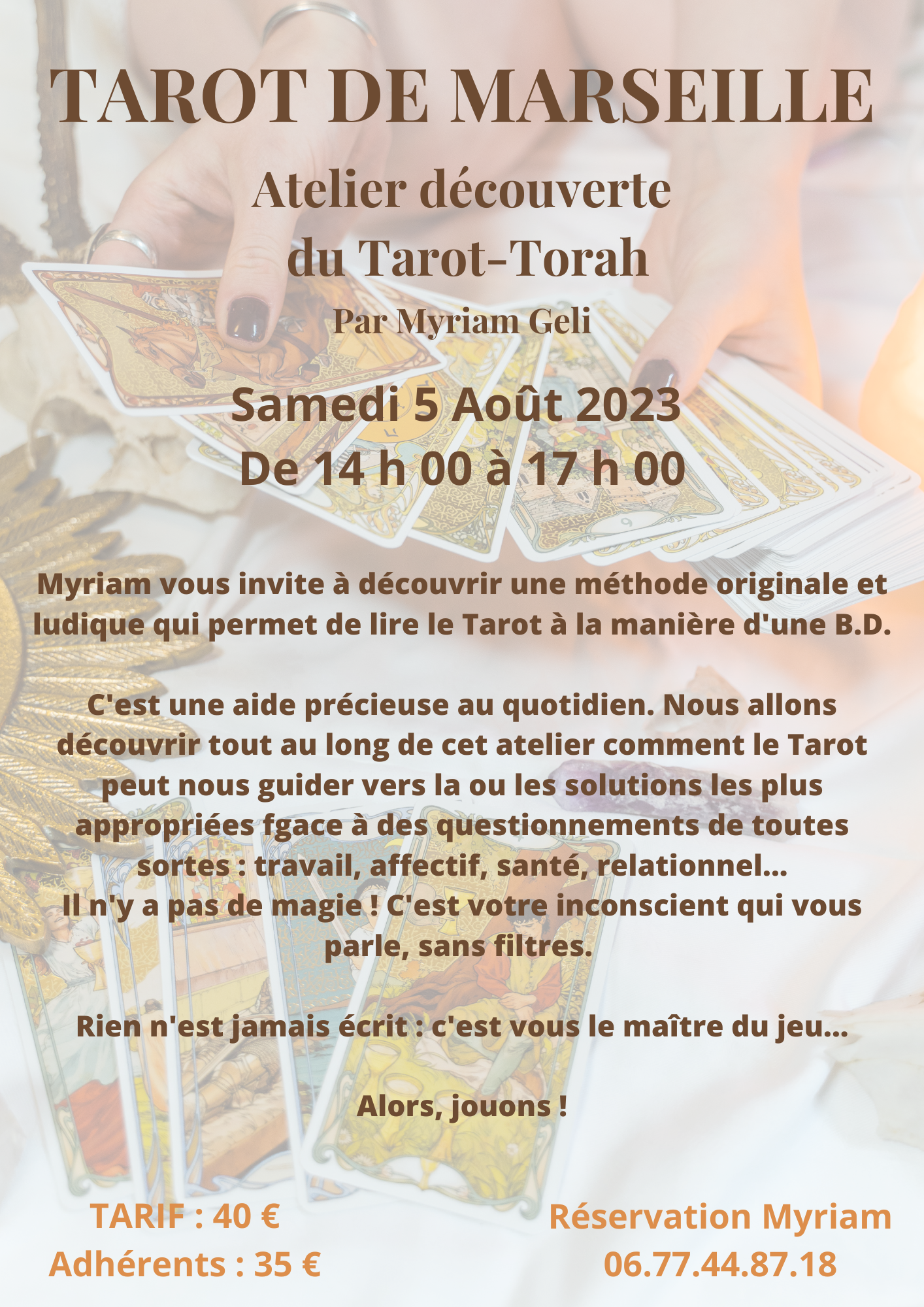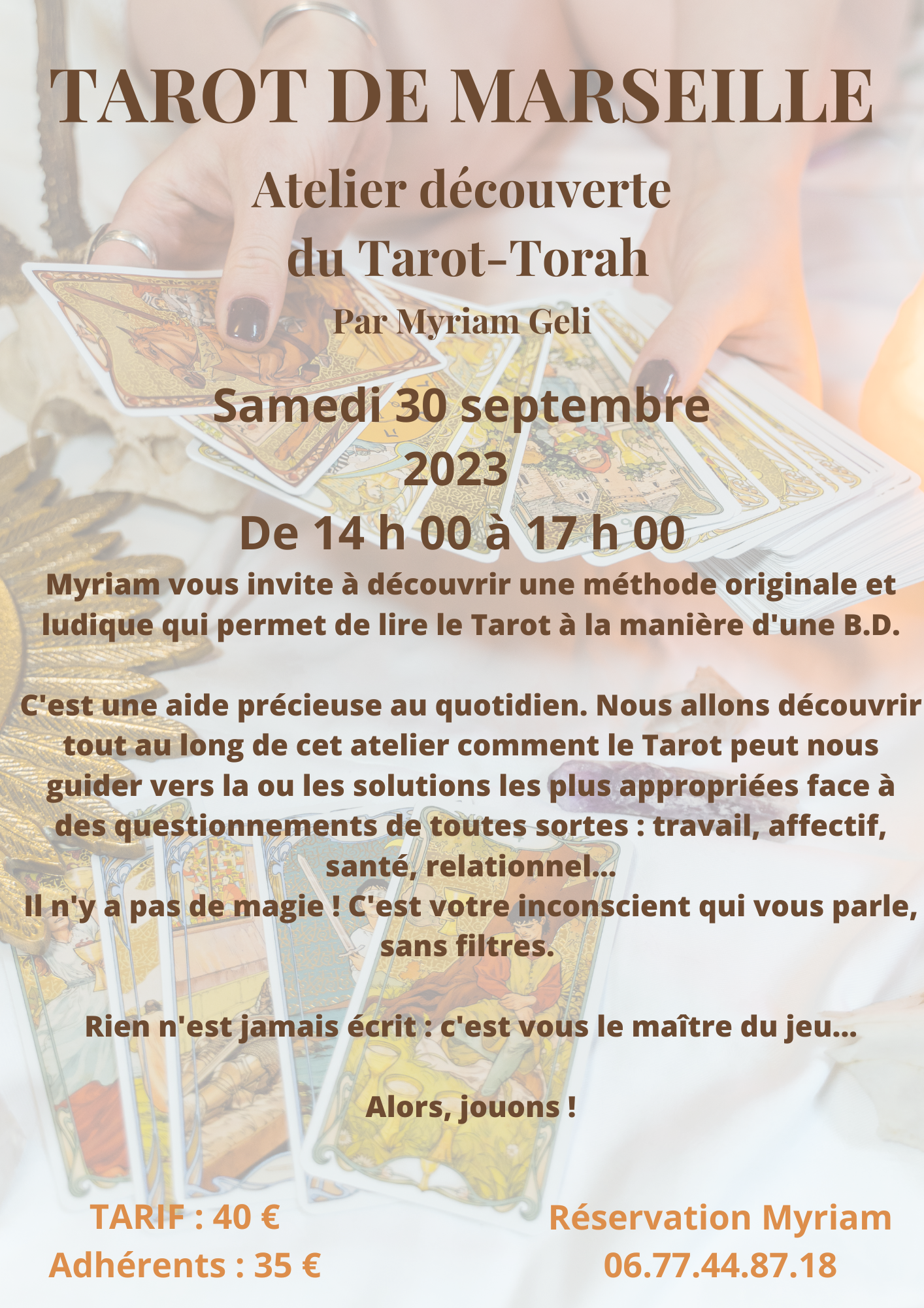 Myriam Géli, vous propose une nouvelle date pour ses ateliers découvertes sur le Tarot de Marseille, plus précisément le Tarot-Torah. - Le SAMEDI 30 SEPTEMBRE 2023 de 14h à 17h ! - Une façon originale et ludique de découvrir le tarot, c'est votre inconscient qui vous parle, sans filtres ! - Places limitées - Renseignements […]