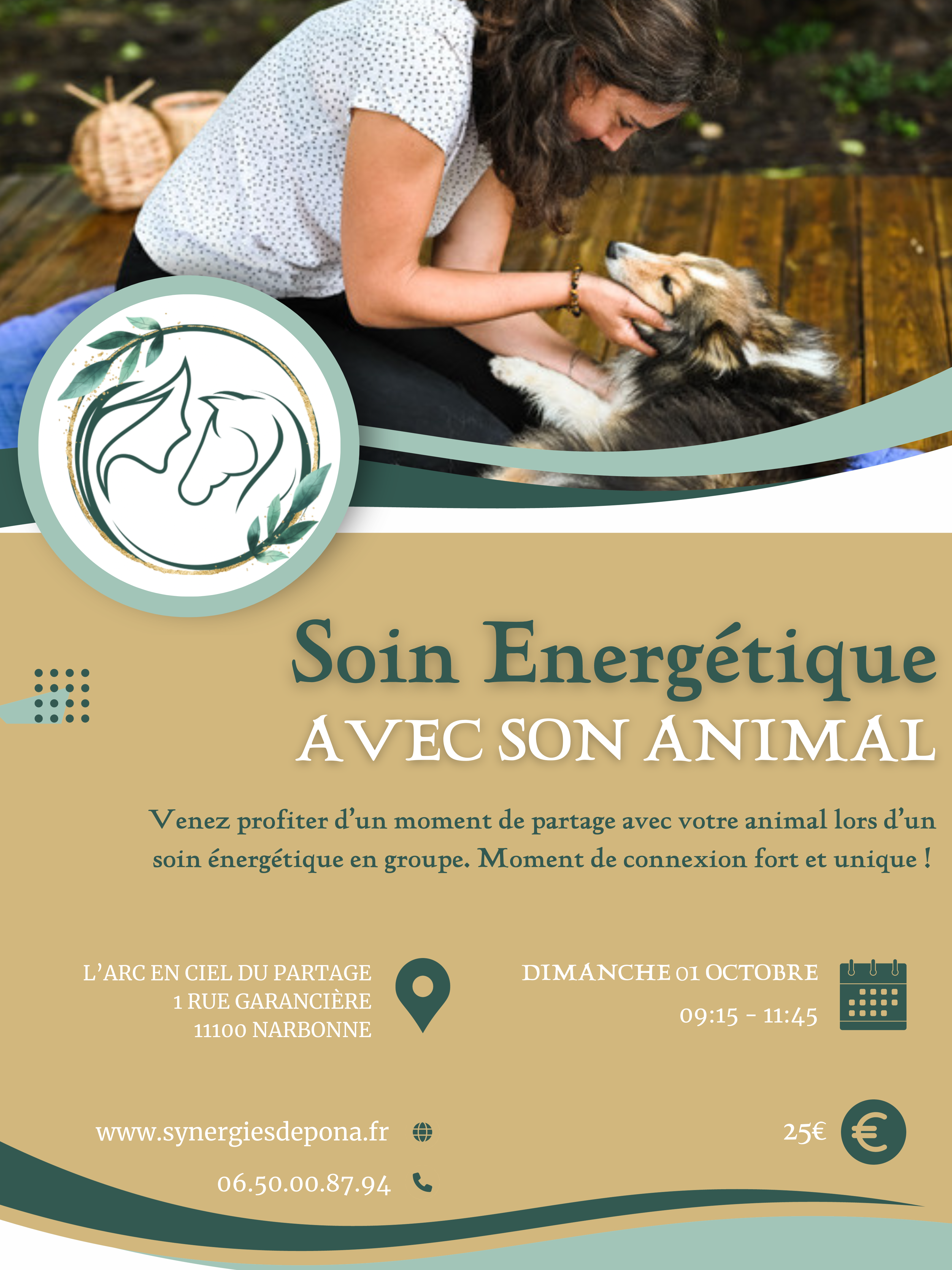 Synergies d’Epona - Isabelle Lefebvre vous propose un soin énergétique avec votre animal, en groupe, le dimanche 01 octobre de 9h15 à 11h45 à l'association ! Un moment de connexion fort et unique - Renseignements et réservation au 06.50.00.87.94 -