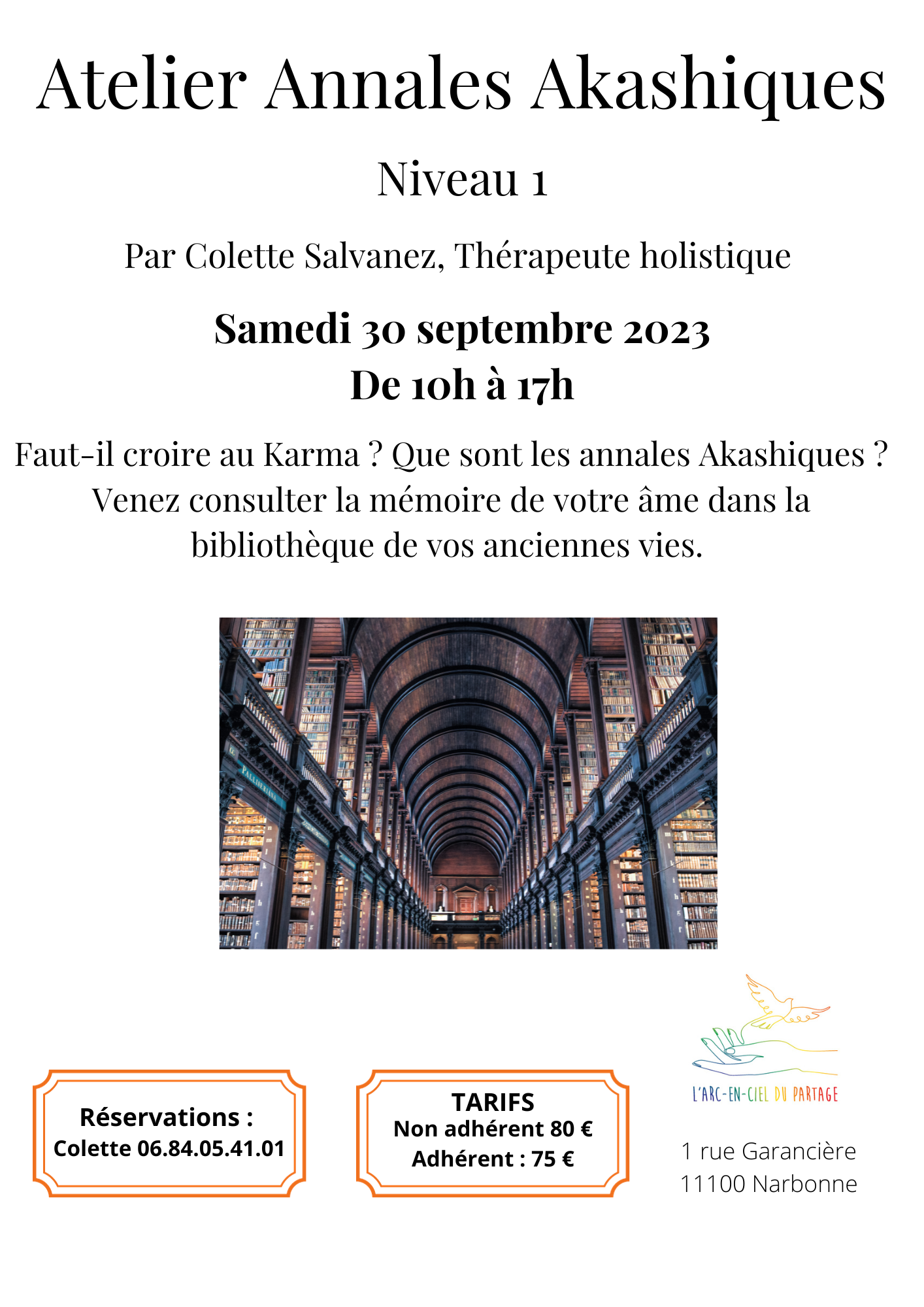 Colette Salvanez, Thérapeute énergétique, vous propose des nouvelles dates pour son atelier sur les Annales Akashiques ! - Le Niveau 1 : le SAMEDI 30 SEPTEMBRE 2023, de 10h à 17h. Venez découvrir la mémoire de votre âme et comprendre comment vous libérer de vos vœux - Places limitées - Renseignements et réservation au 06.84.05.41.01
