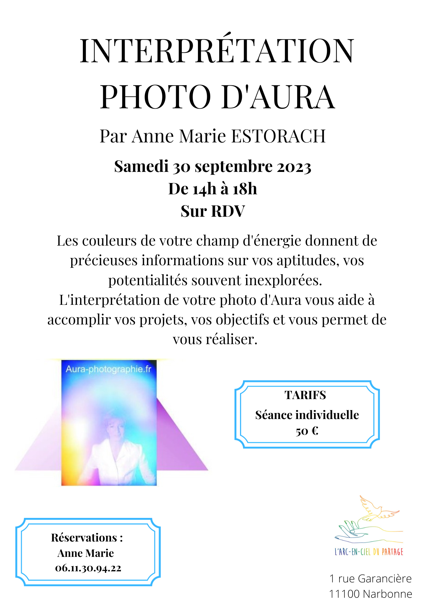Nous avons le plaisir de recevoir Anne Marie ESTORACH à l'association ! - Le SAMEDI 30 SEPTEMBRE 2023 de 14h à 18h - L'interprétation de la photo de votre Aura vous aide à accomplir vos projets, vos objectifs pour vous réaliser pleinement - Renseignements et réservations au 06.11.30.94.22 -